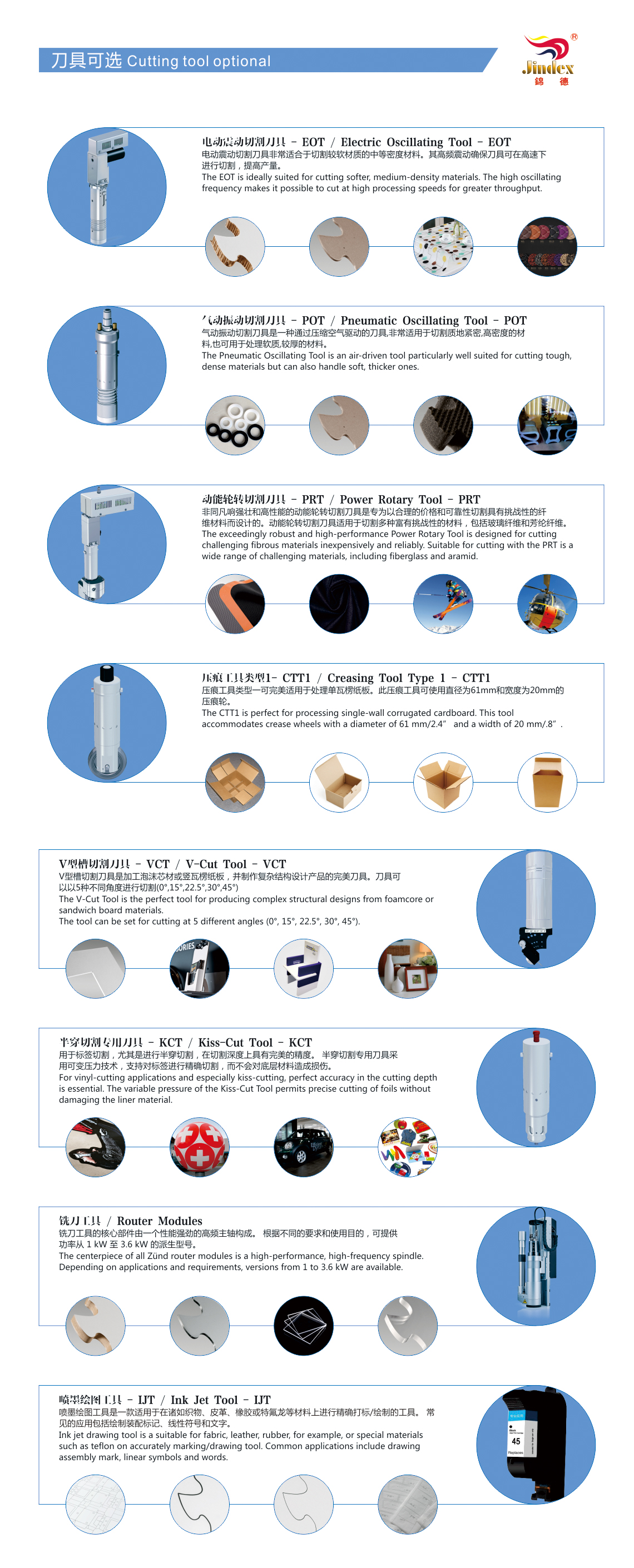 ◇ 配置振動刀、拖刀,筆畫工具以及可選配置半刀,銑刀,開槽刀,圓刀、壓痕刀等多種刀具,可實現(xiàn)寫字畫線、虛線裁切、半斷裁切、全斷裁切、銑刀裁切、多種材料V-CUT開槽、開銑槽、大小壓輪壓痕、硬質(zhì)材料刮痕等實用功能。